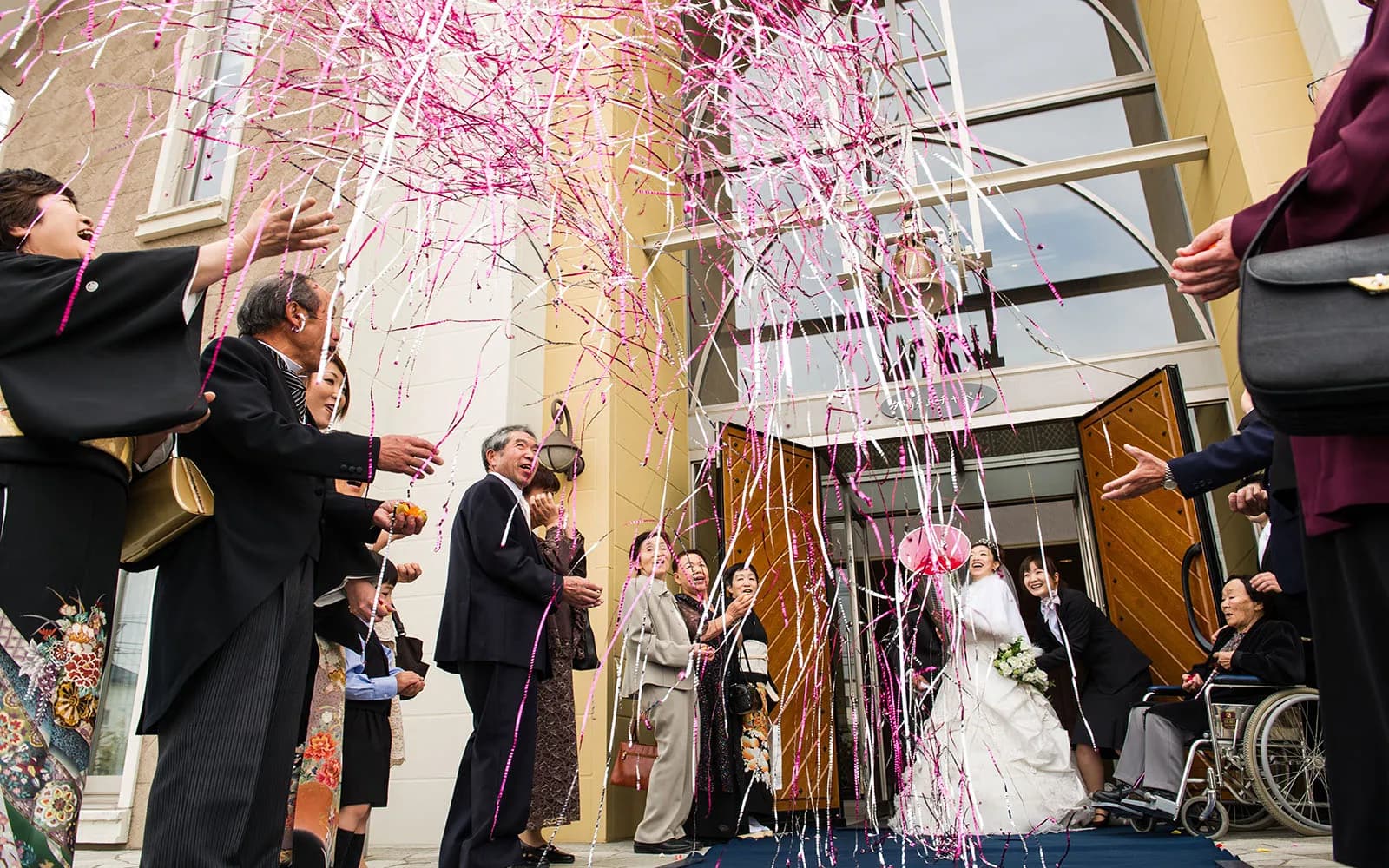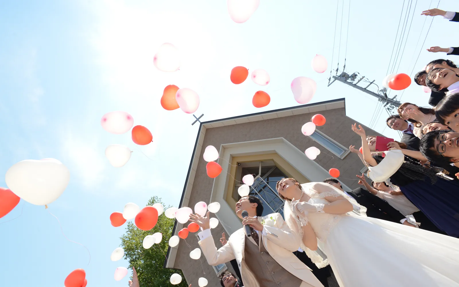 北見夕陽ヶ丘チャペルでの感動的な挙式を経て、選ばれた会場で盛大なパーティーを。挙式料とお好みの当日衣裳プランを組み合わせて、お二人とゲストに最高の時間を提供します。愛の誓いを交わした後は、親しい人たちと共に楽しいひと時を。