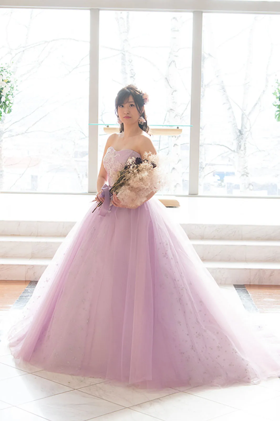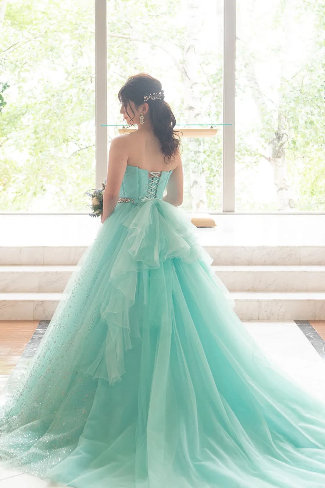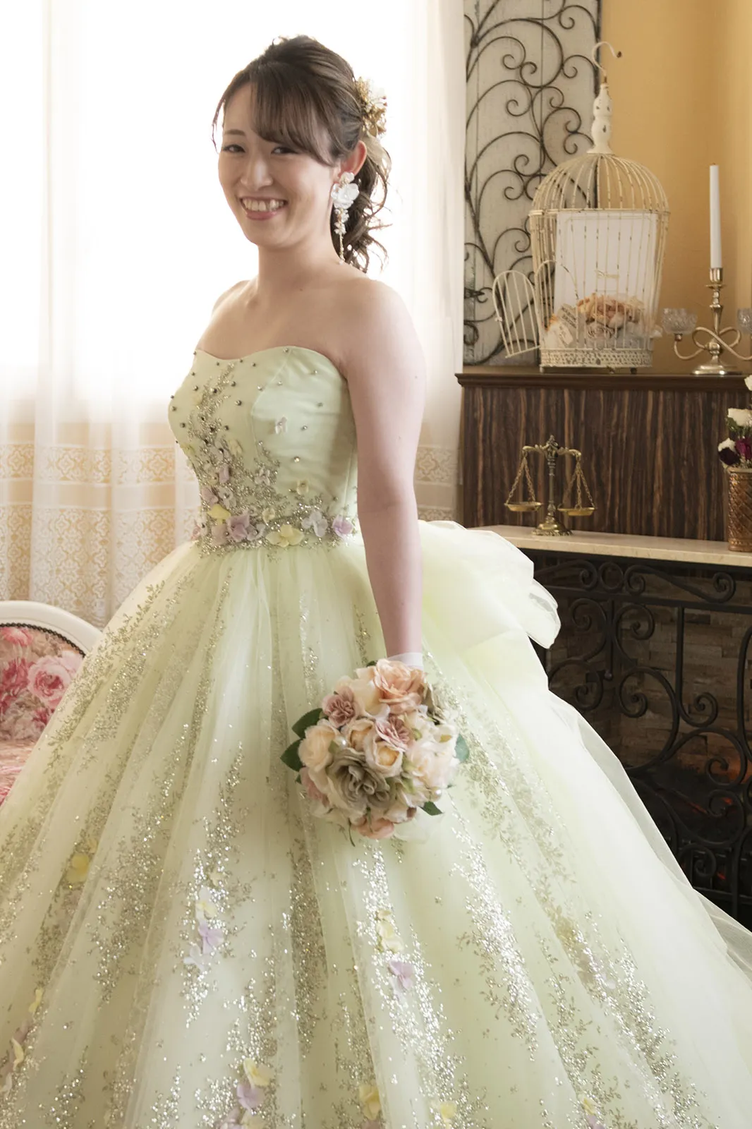 カラードレスは多彩なお色の中からの選択となりますが、自身の好きな個性を表現できるドレスを見つけるためには、 季節感や、披露宴会場の雰囲気を考えると、より素敵な花嫁姿を実現できるでしょう。 また、ウエディングドレスと全く異なるラインを選ぶことで、ギャップを楽しむこともできます。 キャンドルサービスや、お客様のお見送り等、列席の方との距離が近いことが多いので、 アクセサリーやブーケもトータルコーディネートされることをお勧め致します。