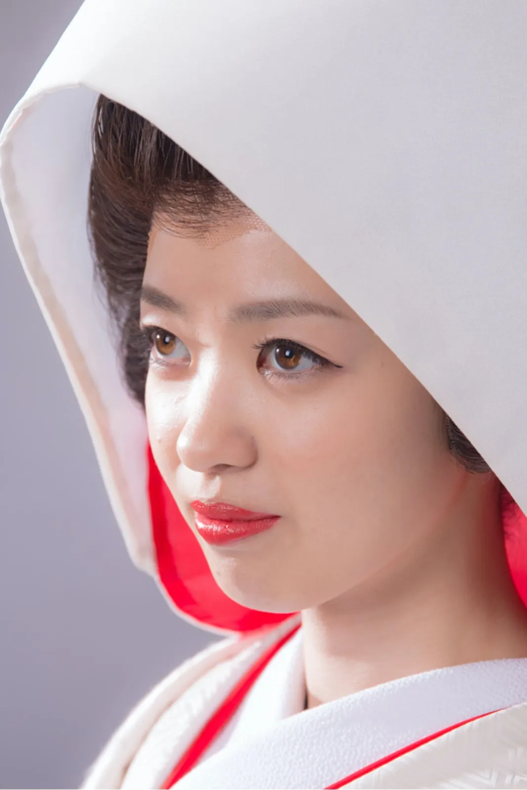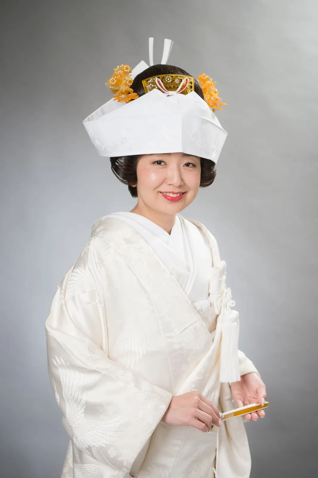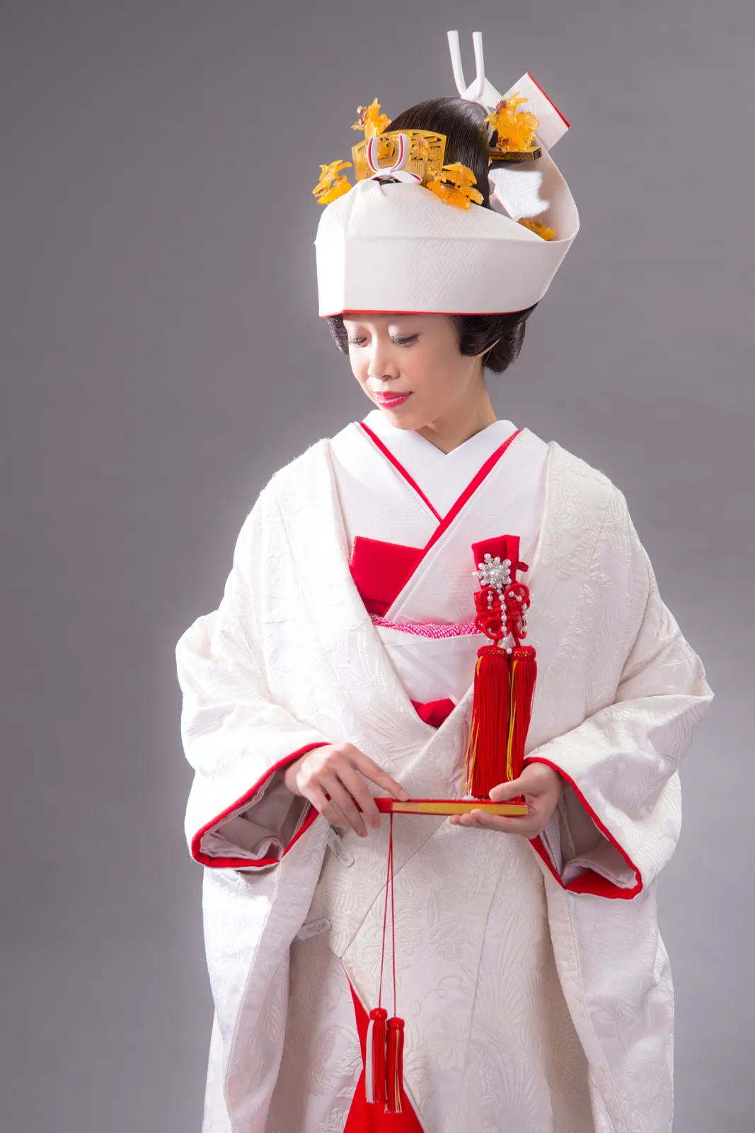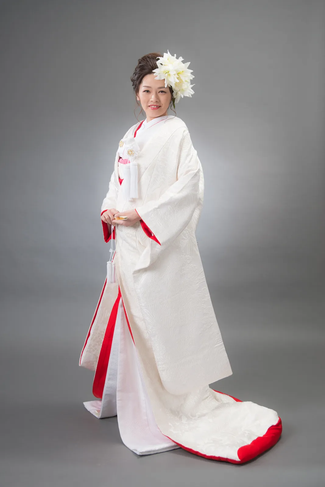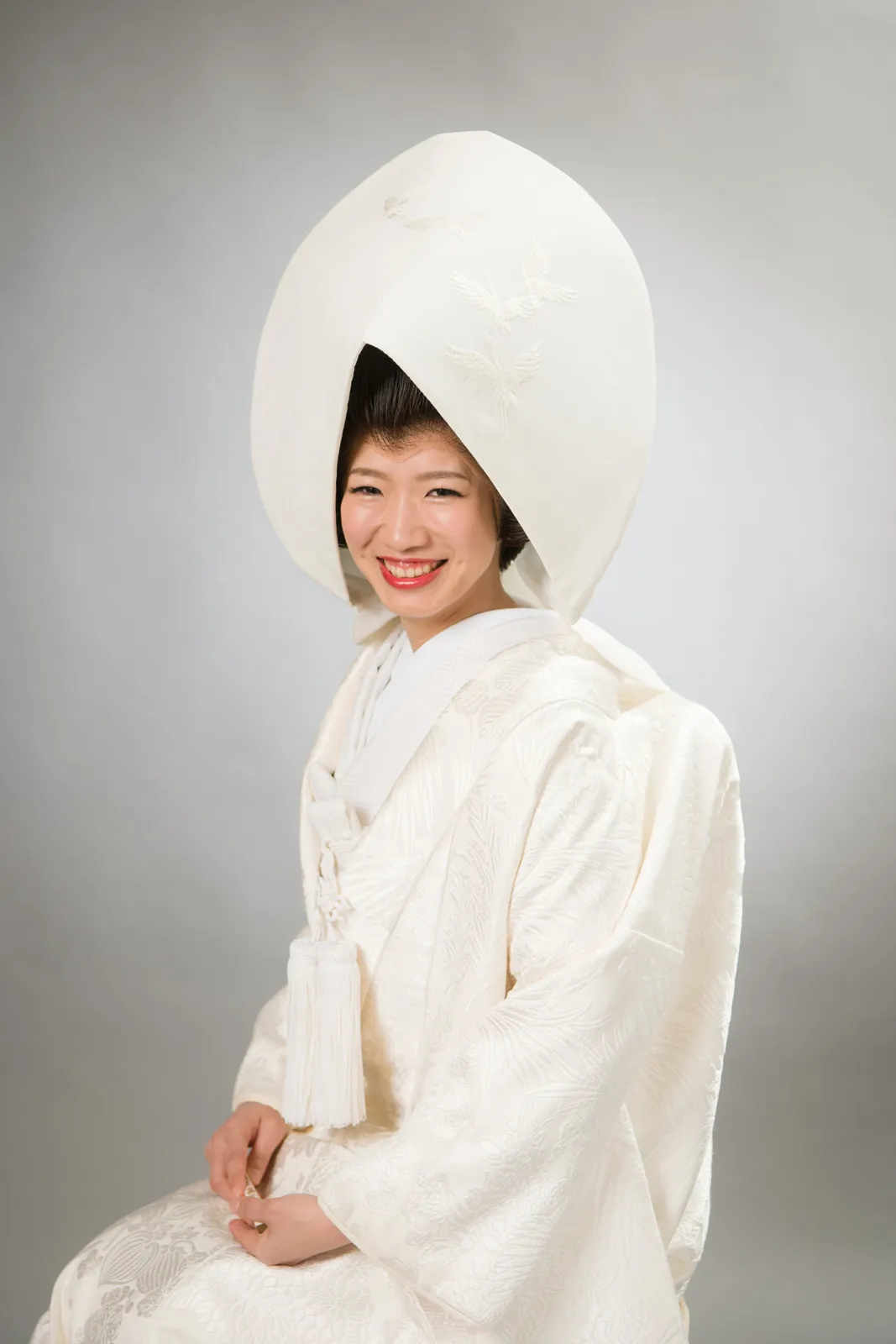 日本古来の婚礼衣裳として長い歴史を持つ白無垢。打掛から掛下、帯、小物まで全て白一色に統一した花嫁姿は純真さ、 清浄さの象徴と言えるでしょう。白は日本において神事の色として特別視されていたことからも、 婚礼という行事が女性にとっていかに神聖なものであり、新たな人生を歩むための強い決意が込められたものであるということがわかります。 かつらに綿帽子もしくは角隠しを付けた花嫁からは伝統的で崇高な精神美を感じさせられます。