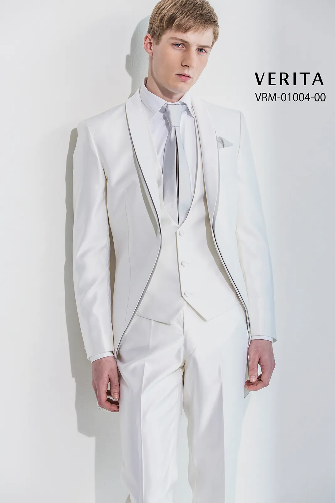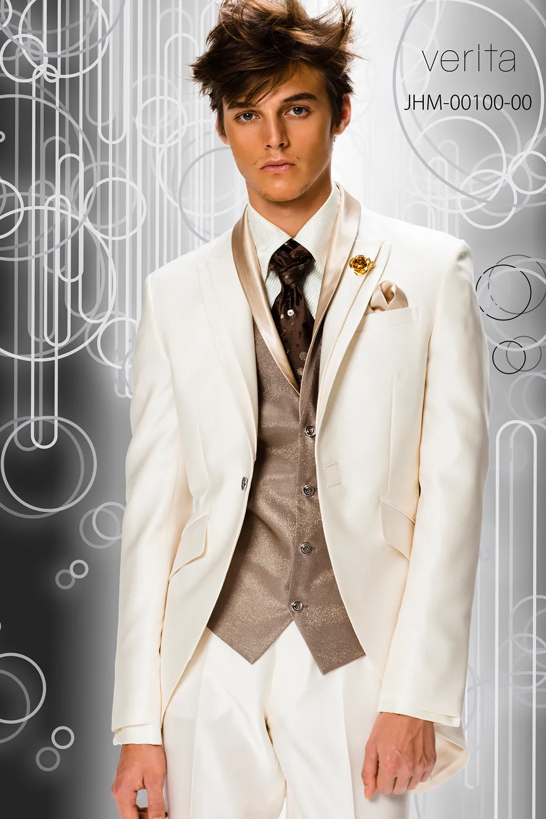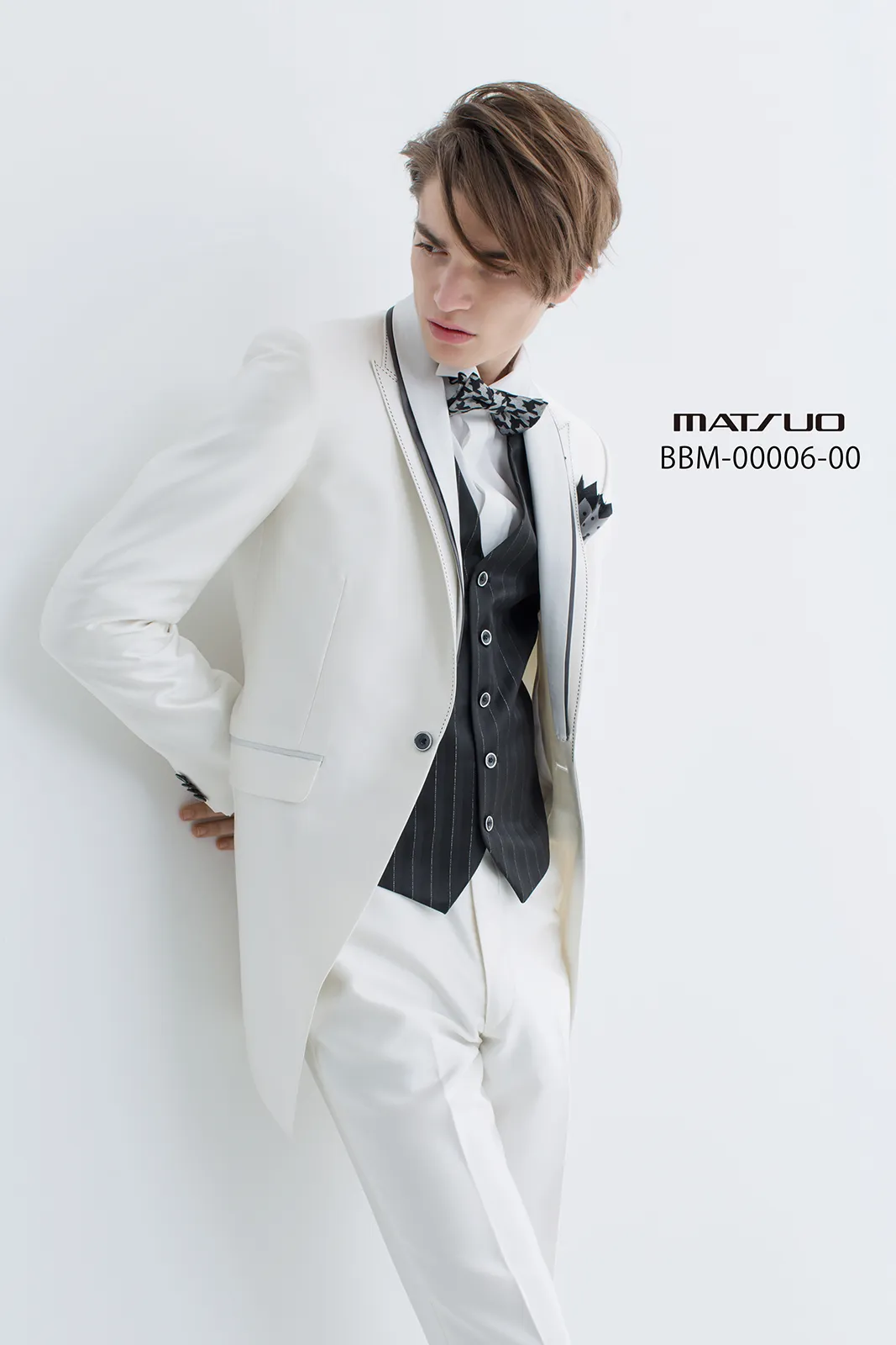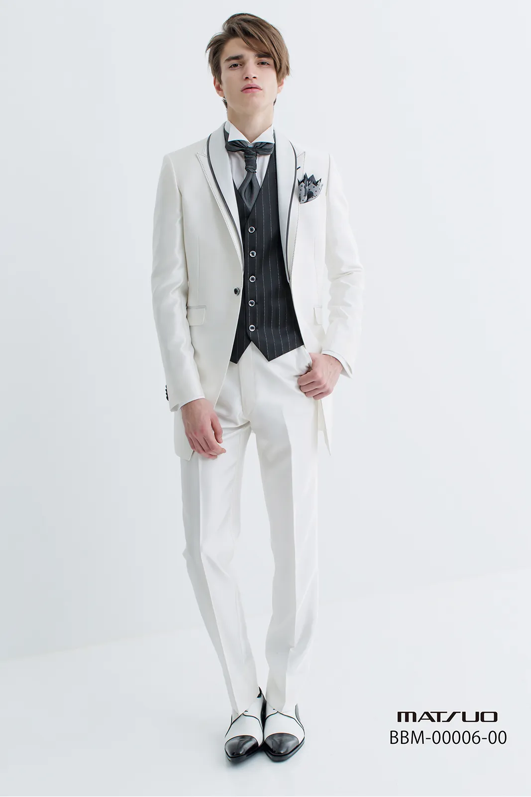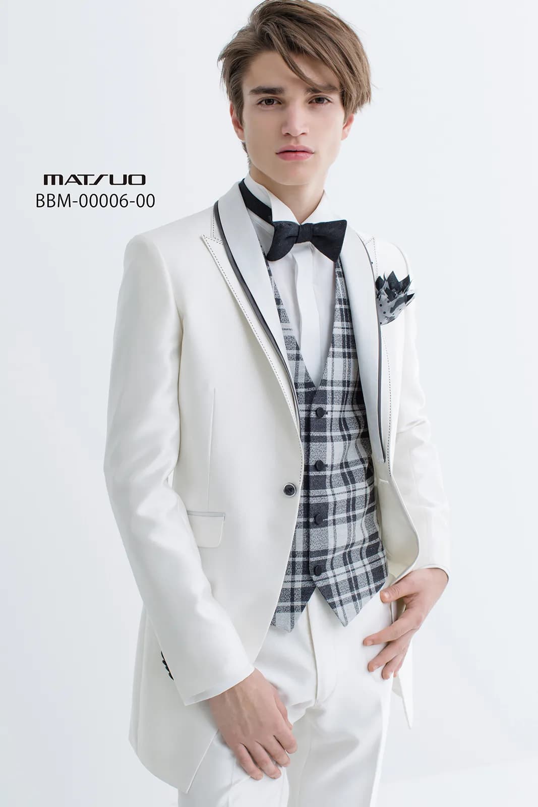結婚式で最も多く着用されるのがタキシードですが、形だけではなくサイズ、 色のバリエーションも豊富で、普段着ることが少ない白系タキシードや、 光沢感があり個性的なデザインのタキシードは当日の結婚式をより素晴らしいものにしてくれるでしょう。 結婚式の雰囲気、花嫁の衣裳とのバランスを考えて新郎も主役にふさわしい一着をお選び頂ければ幸いです。