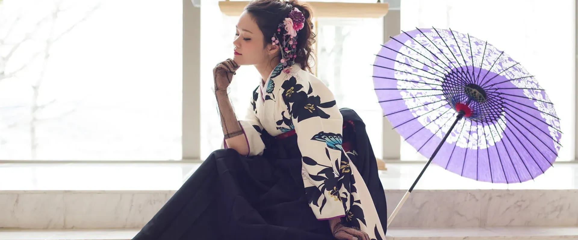 ■ 衣裳 9点(中振袖、袴、半幅帯、長襦袢、衿芯、重ね衿、草履、防寒草履、巾着)■ 着付け ■ ヘアセット ■ 写真1ポーズ